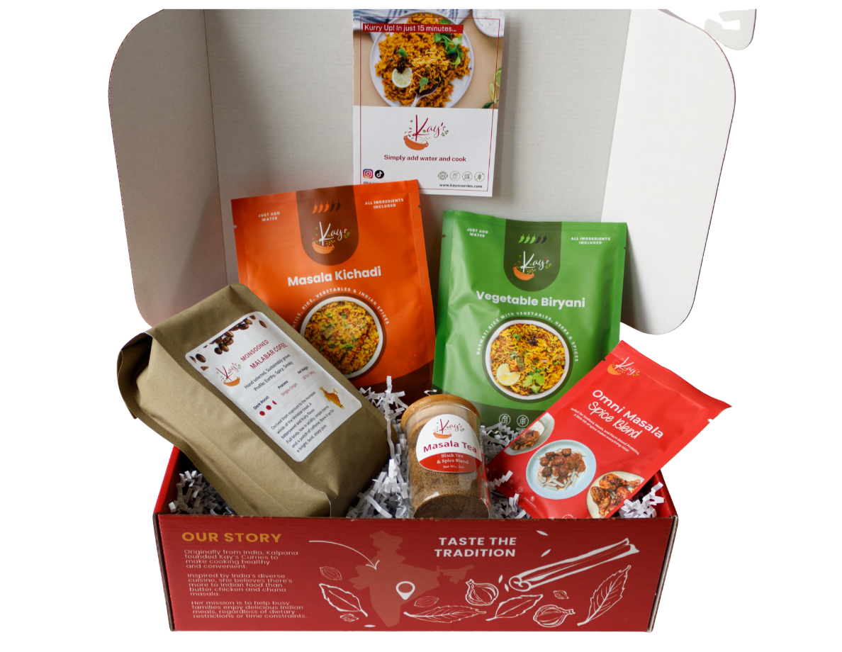 The Comfort Classics Gift Box is a cozy, ready-to-gift set filled with small-batch Indian comfort foods - Masala Kichadi, Vegetable Biryani, Masala Tea, Coffee, and Omni Masala. Handcrafted and proudly made in the USA, all items are gluten-free, vegan-friendly, and free from the top nine allergens.